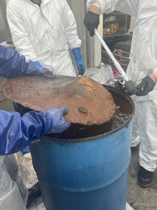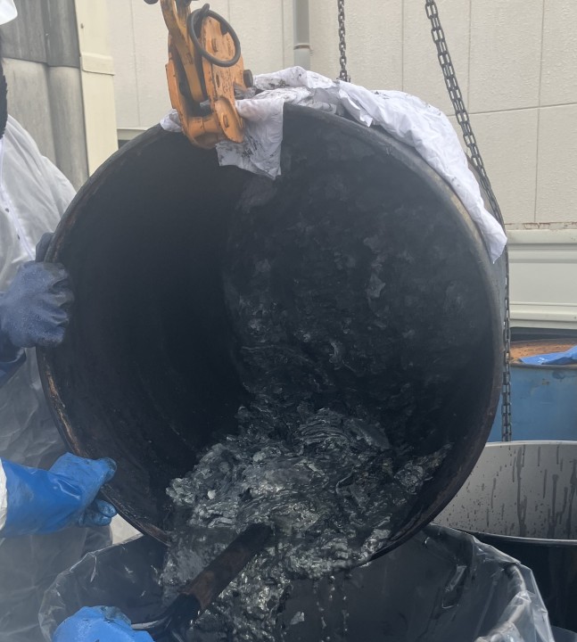内容物が不明で、長年の間、放置されております古いドラム等は処理がなかな進まないケースが多いです。特に、クローズドラムの中で固化してしまってたり、クローズドラムの小口の蓋が劣化のため開放できず、内容物のサンプリングができない場合、その後、どう進めたら良いかわからず、更に放置されてしまいます。最悪のケース、ドラム缶が劣化し内容物が漏洩してしまうことも考えられます。そこで、弊社では、このようなドラム缶の上部を天切りし、内容物を新しいドラム缶に移すという作業を行っておりますので、一部、ご紹介致します。